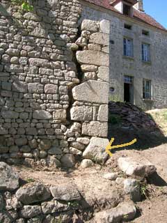 La pierre de fondation (marquée d'une flèche) avait basculé, entraînant une séparation de l'angle, avec un « coup de sabre » bien visible.