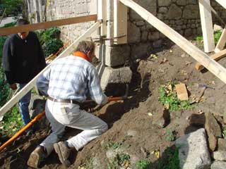 Le rebouchage du « coup de sabre » est réalisé avec le même mortier sec pour éviter le retrait. Il ne faut pas oublier les pierres qui renforceront l'ouvrage.