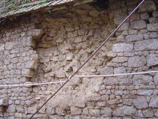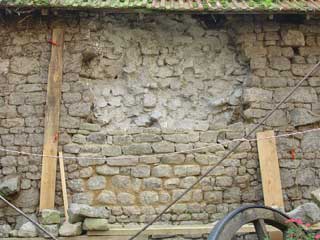 Ici, les pierres sont posées à joints refluants, avec un mortier au tuf (la compatiblité de la couleur est garantie car le tuf est de la même nature que les pierres, à la différence d'érosion près).