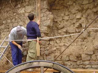 La pose de règles pour tenir le cordeau permet de fixer des repères pour respecter l'horizontalité des lits de pierres et l'alignement du plan du mur.